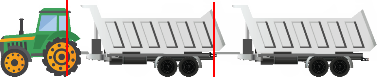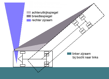Voor vrachtverkeer komt hierbij als voorwaarde dat bij achteruitrijden bochten rechtsom uiterst moeilijk kunnen worden gemaakt, vooral bij gelede voertuigen. Bij rechtsom achteruit draaien hebben chauffeurs geen zicht op de achterkant van de wagen en rijden in feite "blind", zie figuur. De gekleurde gebieden geven aan wat ongeveer waar zichtbaar is. Chauffeurs rijden in de praktijk daarom liever een blokje om als ze dan linksom achteruit te kunnen draaien. Door het raampje open te draaien en hoofd buiten boord te steken kunnen ze dan deze hele zijkant en wat er achter de wagen is in de gaten houden. Op deze manier kunnen ze de combinatie vrij strak om een hoek laten draaien. Indien rechtsom achteruit moet worden gedraaid moet niet alleen meer veiligheidsmarge worden toegepast maar bovendien is het veilig/noodzakelijk iemand de achterkant van de wagen in de gaten te laten houden en zonodig tijdig "HO!" te laten roepen. |