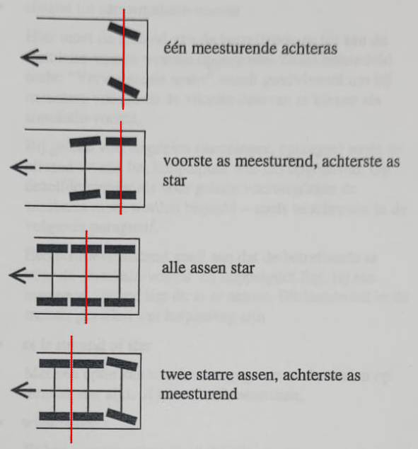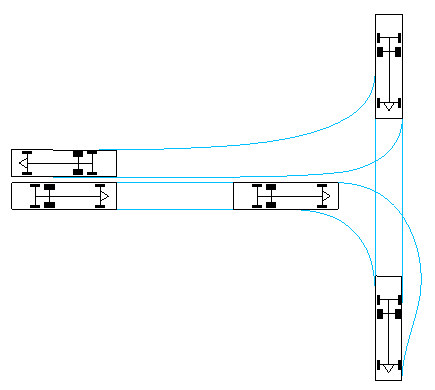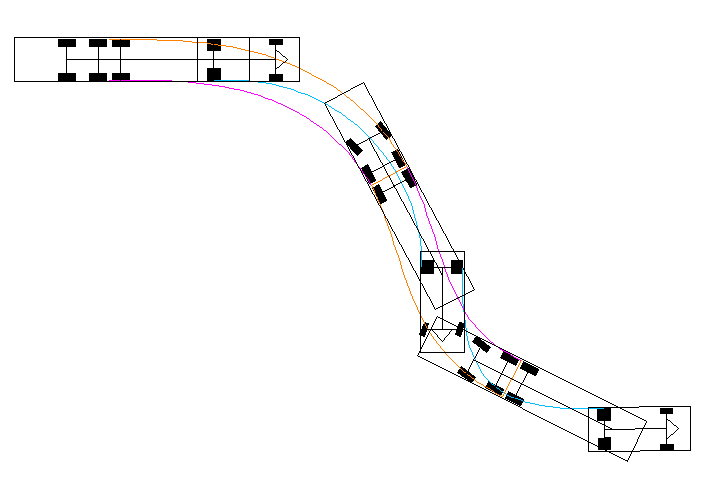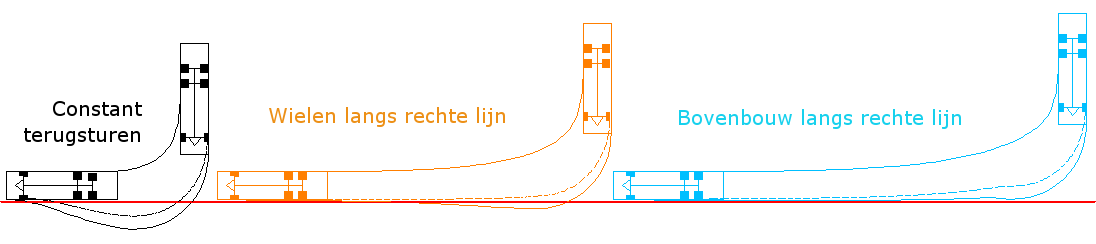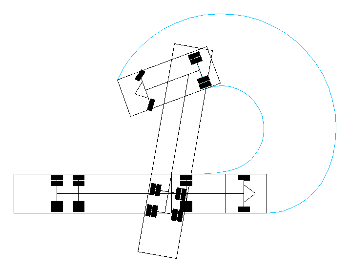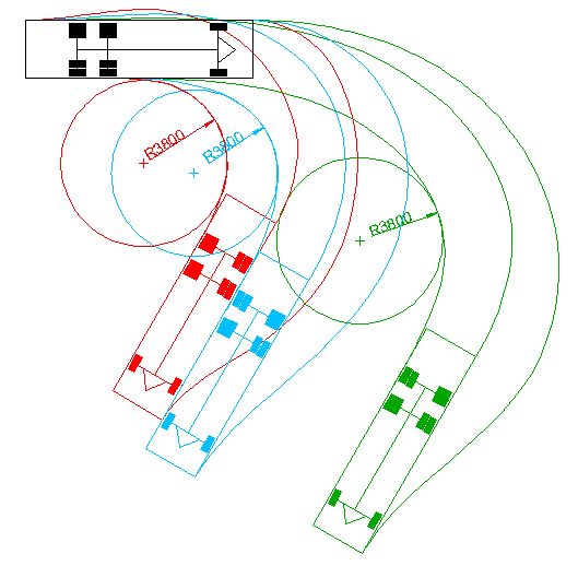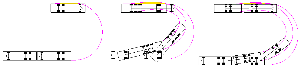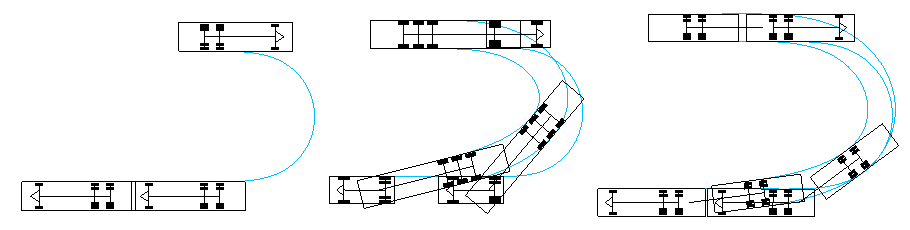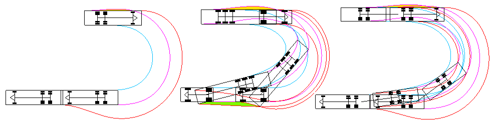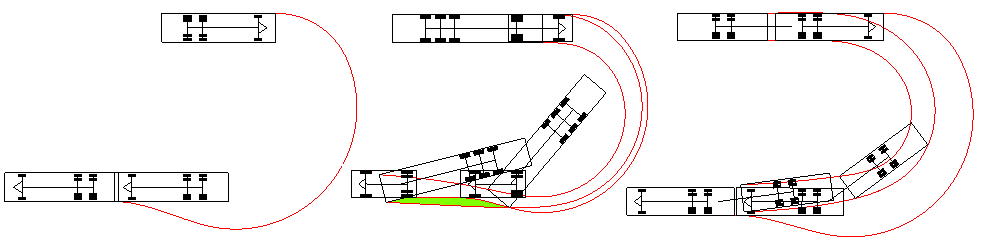 NB: de opgegeven minimale straal bij de trajectgegevens heeft betrekking op het solo voertuig of het trekkende voertuigdeel, een geleding kan echter toch nog een kleinere straal doorlopen. Bijvoorbeeld om te voorkomen dat een trekker-oplegger combinatie bij een bocht vooruitrijden schaart (zoals in bovenstaande figuur) mag de trekker bocht met kleinere cirkel dan 8 a 9 meter doorlopen.