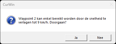 Indien de optie Bocht volgen is gekozen, en er een krappe bocht wordt gemaakt is het verstandig na uitvoering van de simulatieberekening de logfile te raadplegen om te controleren dat de snelheid niet te ver is gedaald. Voor het belang van voldoende hoge snelheid zie bij Trajectgegevens.