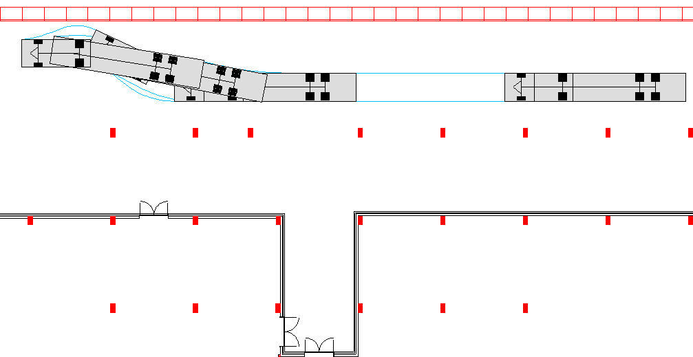 Wanneer een bocht zo krap wordt genomen dat twee voertuigdelen haaks op elkaar komen te staan zal het rekenprogramma een waarschuwing geven dat het voertuig is geschaard. DIT MOET WORDEN VOORKOMEN !Scharen leidt tot extreme slijtage (en in de regel ook schade!) aan zowel voertuig als wegdek. Bij voertuigdelen met meerdere achterassen, zoals de oplegger in deze afbeelding, moet de minimale straal niet kleiner worden dan 2 meter, aanbevolen niet kleiner dan 4 meter.