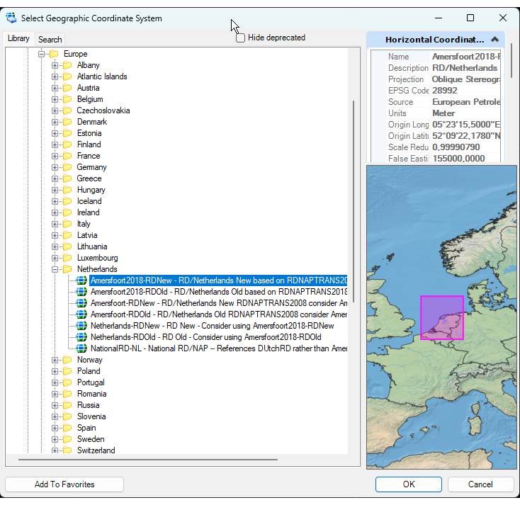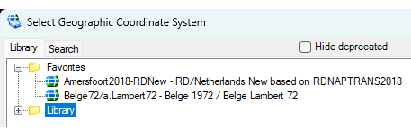 1. Je kunt vervallen coördinaatsystemen eruit filteren door de optie 'Hide deprecated' aan te vinken: