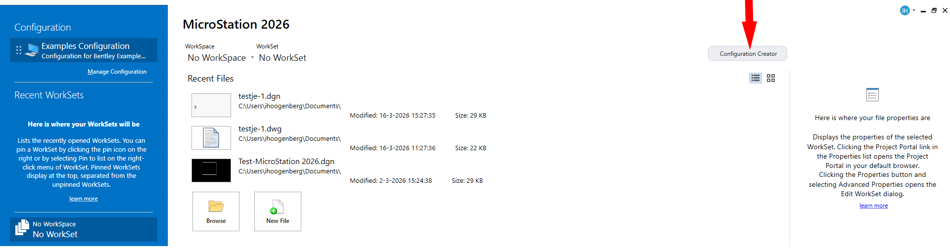 In het Startscherm van MicroStation is rechts bovenin een nieuwe knop verschenen: Configuration Creator:
