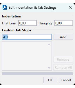 In het scherm dat verschijnt als je op 'Indentation & Tab Settings' klikt kun je een tab ((of een hele serie) instellen: