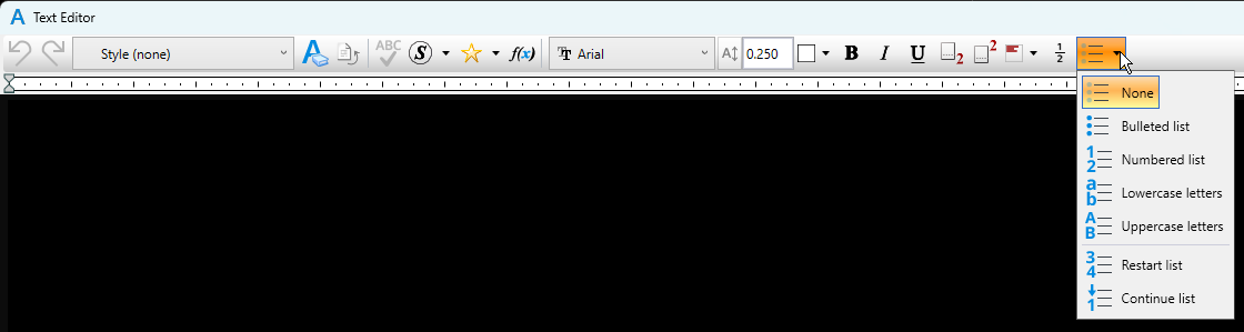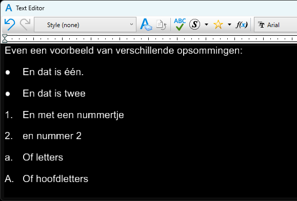2. Het is mogelijk geworden om opsommingen te maken in de Text Editor. Er is daarvoor een extra knop toegevoegd:Hieronder zie je hoe de verschillende opsommingen eruit zien:Het werkt verder exact zoals je verwacht.De knop voor 'Restart list' zorgt dat je een nieuwe opsomming kunt beginnen direct onder een eerdere opsomming (zonder door te nummeren) en de knop'Continue list' verandert die nieuw gestarte opsomming weer in een continuering van de eerdere opsomming.