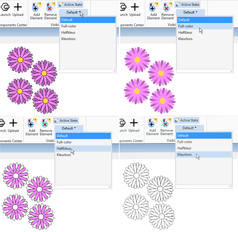 Hieronder zie je hoe de bloemen getoond worden bij de verschillende Visibility States: