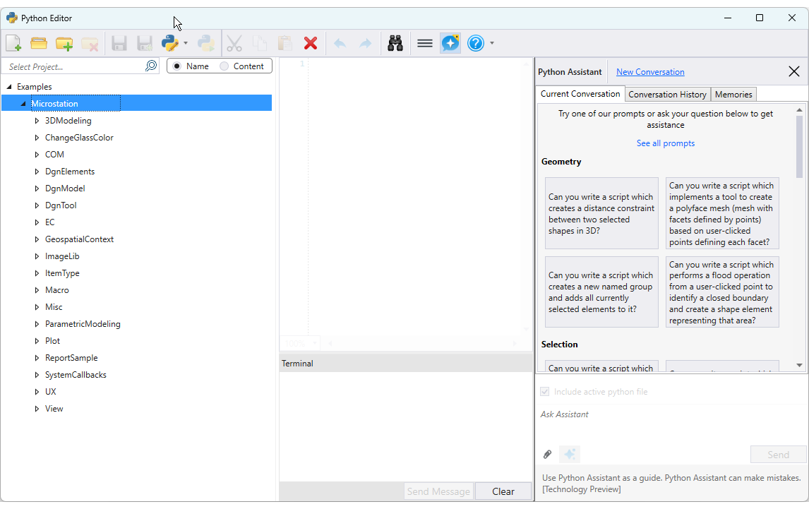 Deze op AI gebaseerde tool is vooral bedoeld om je te helpen bij het begrijpen en leren wat MicroStation kan en doet. De bronnen zijn voornamelijk de eigen Bentley documentatie.  In het scherm kun je vragen intypen en Bentley Copilot komt met antwoorden en suggesties.