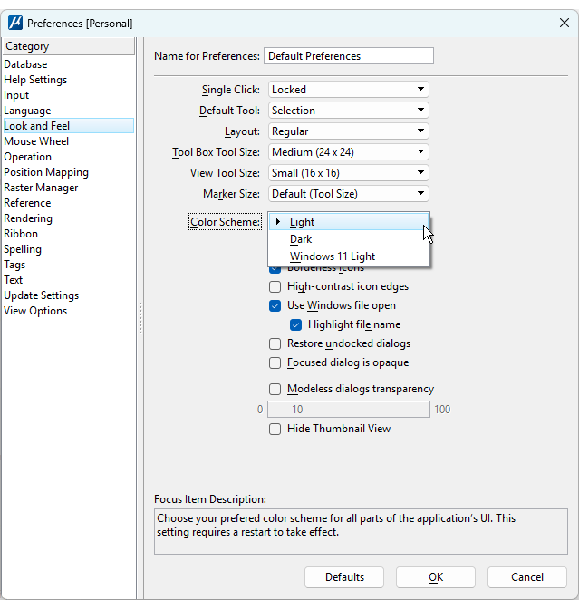 Voor het toepassen van de Windows opmaak voor de schermen van MicroStation. Dit is een persoonlijke instelling en dus te vinden bij de File tab > Settings > User > Preferences op tabblad Look & Feel: