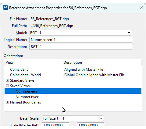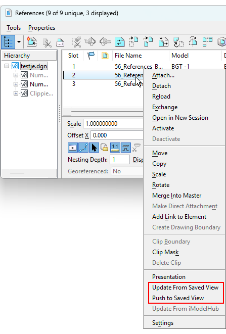 Als je een Saved View gemaakt hebt met daarin instellingen en een lagenstructuur en je hebt die opgeslagen dan kun je dezelfde Saved View ook gebruiken als je het bestand als Reference hebt gekoppeld.