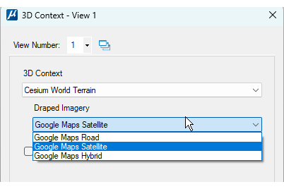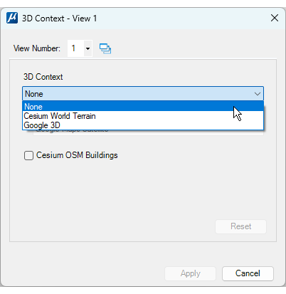 En het gaat om de knop 3D Context in de groep Geospatial. In het bijbehorende scherm kun je kiezen uit bijvoorbeeld 'Cesium World Terrain' of 'Google 3D':