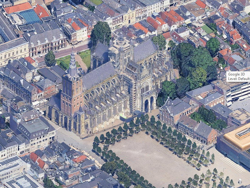 Als je kiest voor Google 3D, dan wordt sowieso Google Satellite gedrapeerd. Afhankelijk van de locatie is er wel of niet 3D informatie bekend. Hieronder zie je de St. Janskathedraal in Den Bosch die er netjes in 3D instaat: