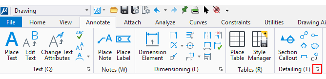 Daarvoor ga je naar de groep Detailing op tabblad Annotate en je drukt op het kleine knopje in de rechter onderhoek van die groep: